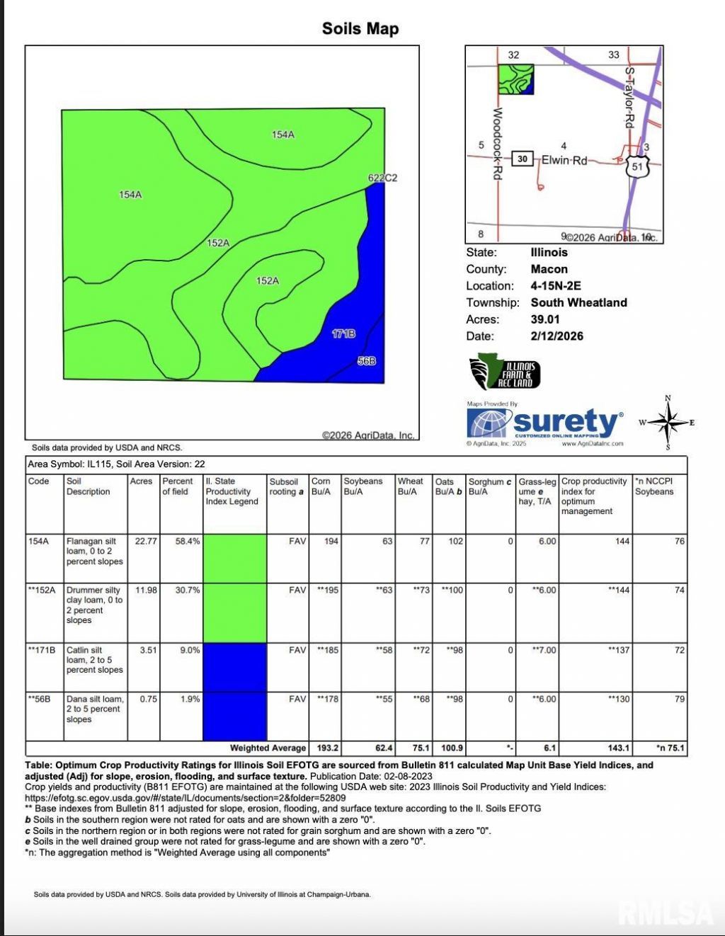 Must see Class A Macon County, Illinois tillable farm. High-quality tracts in this area are tightly held, and this farm represents an outstanding investment opportunity in the heart of Central Illinois. The property boasts an impressive 143.1 Productivity Index, consisting primarily of Flanagan Silt Loam and Drummer Silty Clay Loam soils?two of the most sought-after soil types in the region. This soil makeup supports strong, consistent yields and long-term productivity. Located just south of Decatur and one mile west of Elwin in Section 4, T15N-R2E, South Wheatland Township, the farm offers convenient access and excellent logistics. The tract features solid hard-road frontage along the west side, providing easy access for equipment and grain hauling. Additionally, there is a 65-acre tract located three-quarters of a mile south of this property that is also available, presenting a potential opportunity for expansion. SCHEDULE YOUR SHOWING TODAY!