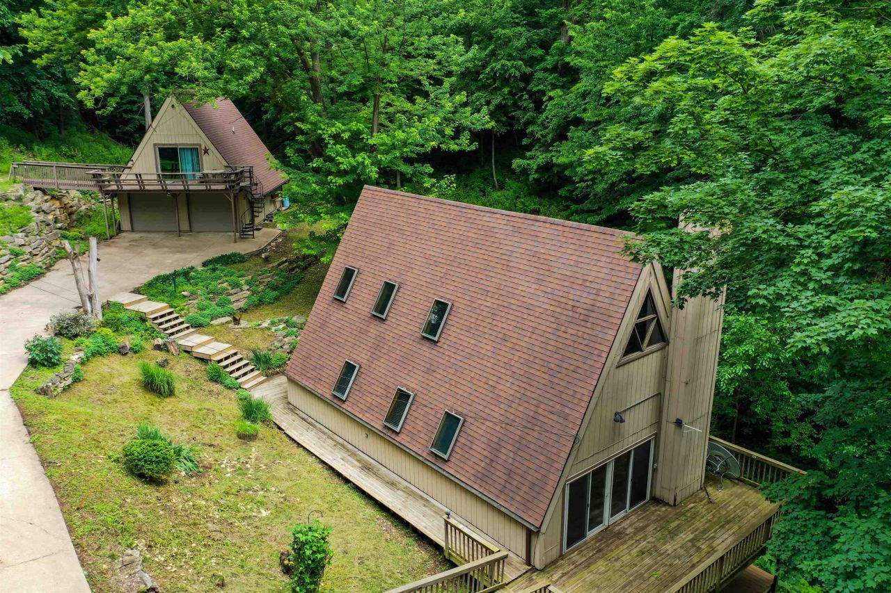 2 homes for the price of 1! This breathtaking A frame is nestled in the woods surrounded by natural beauty and a nature preserve. The main home is 2 bedroom, 2 bath with a walk in closet and private bed and bath in the loft area. Beautiful wood flooring, stainless steel appliances and character you'll never get tired of. The "bunk house" above the garage is cute as can be and just the perfect size, 768 sq. ft. This second home has just as much character and charm as the main house offering a nice sized bedroom on the main level and a second bed in the loft. But wait, there's more! 2 stall heated garage with extra room for storage. The large green space below the house can be used as a yard for family gatherings or it's zoned for camper parking or tiny homes.